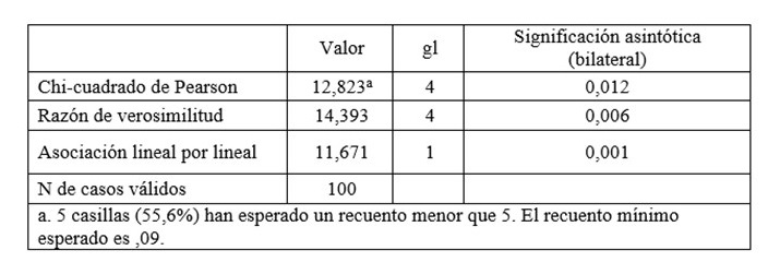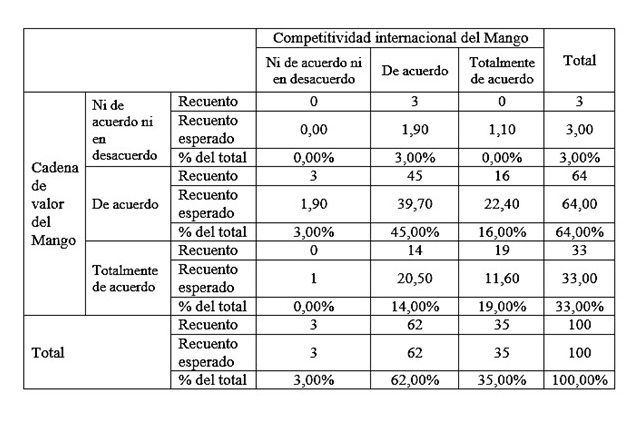 El chi-cuadrado de Pearson es 0,012 es menor 0,05 el nivel de significancia por lo que se rechaza la hipótesis nula y se acepta la hipótesis alternativa, esto quiere decir que la cadena de valor del mango se relaciona significativamente con la competitividad internacional en los constructos que se presentan en la tabla 1, tal cual como muestra los resultados las tablas 2 y 3, donde se es importante que las empresas estén en constante superación de innovación y mejoramiento de producción para tener presencia en los mercados internacionales.