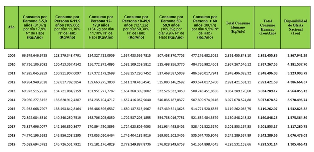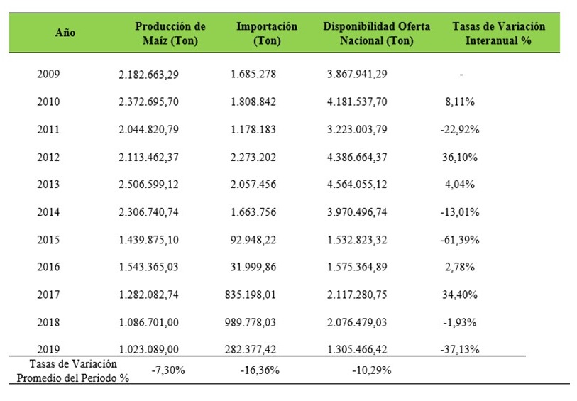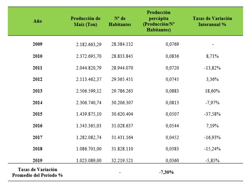 En relación a los niveles de producción e importación del rubro durante el periodo 2009-2019, de un total de cinco (5) indicadores, cuatro (4) mostraron resultados negativos a saber: superficie cosechada (tasa de variación promedio del periodo de -6,35 %), producción de maíz (tasa de variación promedio del periodo -7,30 %), producción per cápita (tasa de variación promedio del periodo -7,30 %), e importación de maíz (tasa de variación promedio del periodo -16,36 %).