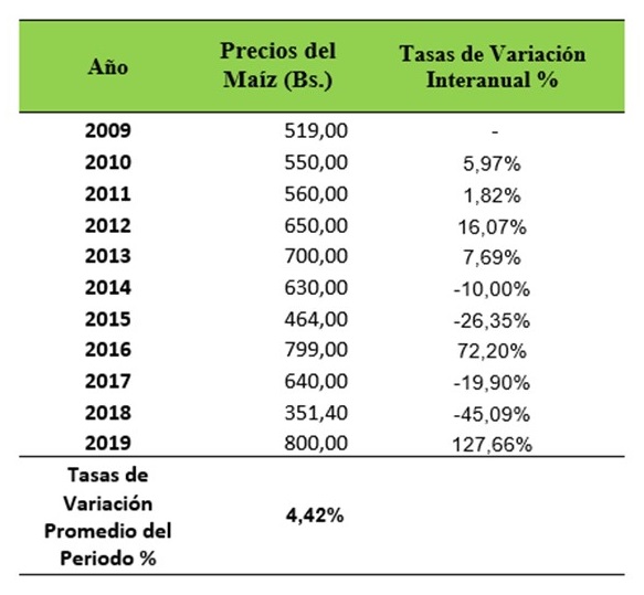 De acuerdo a las fuentes oficiales, se estableció una política de control de precios sobre rubros estratégicos, incluyendo al maíz. Como se puede observar, la evolución del precio durante el periodo se incrementó, esto se comprueba con la tasa de variación promedio del periodo del 4,42 %.