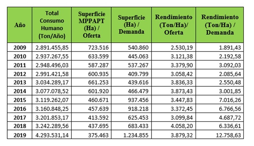 De acuerdo a los resultados obtenidos, el rendimiento por hectárea se incrementó, al notar una tasa de variación promedio del periodo del 4,37 %. Estos resultados significan una mejora en la productividad como producto de la prohibición del uso de semillas transgénicas y la protección de semillas nacionales. De igual modo, la protección al productor y el debido asesoramiento técnico.