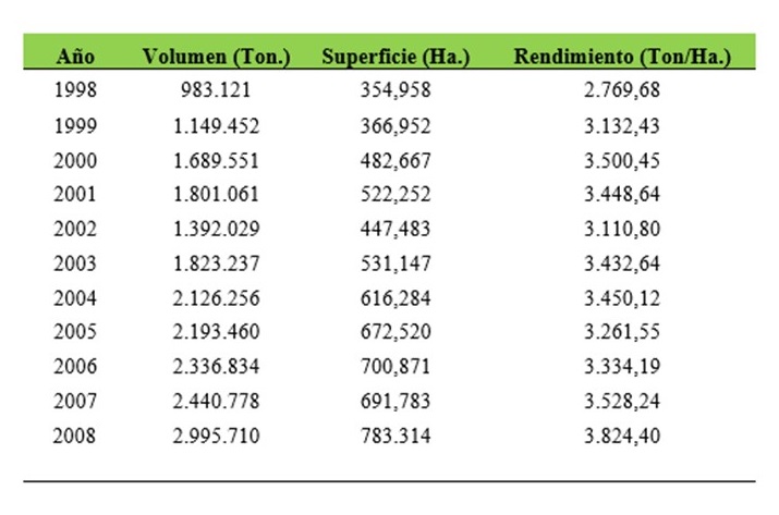 La superficie utilizada fue en ascenso al 7,46 % anualmente pero con un incremento promedio del rendimiento de apenas el 2,97 %.