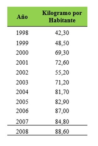 Esto, posiblemente, evidencia la poca efectividad de las mejoras de los cultivares y en las labores de producción y comercialización. En cuanto al indicador consumo de maíz per cápita durante el periodo antes señalado, se manifiesta una tendencia creciente de 6.95 % anual por habitante durante el referido lapso, exceptuando el año 2002 motivado al paro petrolero desarrollado durante ese año el cual afectó considerablemente el desarrollo de esta actividad (ver Cuadro No. 2).