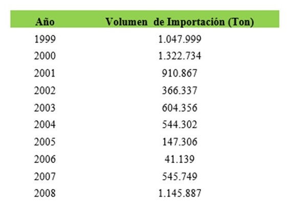 Cabe señalar que en la década anterior el maíz amarillo en Venezuela sólo representaba el 10 % de la producción nacional (Alfaro et al., 2009). Entre los años 2000 y 2001, Venezuela importó en promedio 1.107.346 de toneladas de maíz amarillo (FEDEAGRO, citado por Alfaro et al., 2009). Para el 2009 más del 85% de la producción nacional fue de maíz de grano blanco (Segovia y Alfaro, 2009). En ese sentido, el Estado venezolano redujo las importaciones y restringió el otorgamiento de licencias de importación (ver cuadro No. 3). Durante el periodo de 2002 a 2005, Venezuela importó en promedio 332.460 toneladas de maíz amarillo, con una reducción significativa en el año 2006, donde sólo se importaron 41.139 toneladas (FEDEAGRO, 2007). No obstante, en el 2005 la producción de maíz amarillo fue de 525.495 toneladas y cubrió aproximadamente el 44 % de la demanda (Alfaro et al., 2009) (ver Cuadro No. 3).
