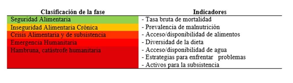 La aplicación de las políticas en materia de seguridad alimentaria, dan como resultado, de acuerdo a la FAO, la propuesta de un sistema de seguridad alimentaria de una determinada región o país, el cual es evaluado por medio de un conjunto de indicadores lo que genera una clasificación en cinco (5) niveles, como se pueden observar en el Cuadro No. 5: