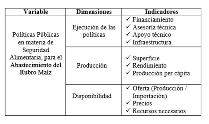 En el caso particular de este estudio, la variable general corresponde a las políticas públicas en materia de seguridad alimentaria, para el abastecimiento del rubro maíz, la cual presenta una definición nominal y varias dimensiones de análisis, así como sus correspondientes indicadores (Tamayo y Tamayo, 2003; Hernández et al., 2006). En este caso, las dimensiones de la variable son ejecución de las políticas públicas, producción de maíz y disponibilidad del rubro maíz, las cuales permiten presentar la operacionalización de la misma (ver Cuadro No. 7).