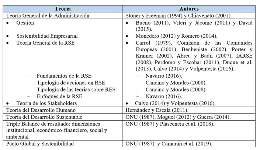 Autores y entidades reconocidas como Mato et al, (2001), Hernández y Escala (2011), Calvo (2014), Guerra (2014), Plascencia et al. (2018), PNUD, Pacto Global y ETHOS- IARSE, entre otros, permitieron fundamentar el tema cuyo marco conceptual responde a las teorías emergentes del enfoque del desarrollo sostenible (ver Cuadro No. 1).