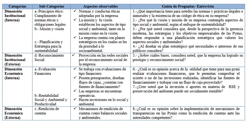 Luego de la presentación de las teorías que sustentan el presente estudio, se considera necesario precisar las dimensiones de la RSE, al asumirla como proceso de gestión en el marco del enfoque de la sostenibilidad, porque precisamente representaron la guía del proceso de investigación para obtener el conocimiento emergente a partir del testimonio de gerentes de las pequeñas y medianas industrias del municipio Iribarren, estado Lara. Al conocer la base conceptual y teórica de la RSE, se pudo comprender el sentido amplio del término. Se identificaron dimensiones que se abordaron desde dos perspectivas (interna y externa), tomando en cuenta que el proceso de gestión se fundamenta en la teoría de los stakeholders o grupos de interés con los cuales la empresa mantiene una relación e interacción dialéctica cotidiana.