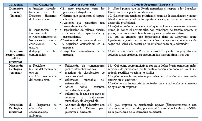 Además de lo expuesto, se considera conveniente indicar que para la construcción de las categorías y sub categorías igualmente se hizo una revisión de los 17 Objetivos del Desarrollo Sustentable que forma parte de la Agenda 2030 como acuerdo mundial en aras de preservar el planeta y la cual está siendo asumida por los empresarios, gobernantes y el tercer sector en el ámbito mundial (PNUD, 2022). También, se contemplaron y enmarcaron las sub-categorías diseñadas en el marco de los 10 principios del Pacto Global que representan el compromiso de los empresarios bajo el enfoque de Ciudadanía Corporativa. Con respecto a los elementos o factores de la Gestión y Sostenibilidad Empresarial los cuales fueron identificados, según cada una de las dimensiones que son objeto de estudio, se tomaron en cuenta básicamente los Indicadores ETHOS-IARSE para Negocios Sustentables y Responsables (Instituto ETHOS de Empresas y Responsabilidad Social e IARSE, 2013), que son referencia a nivel de Latinoamérica como instituciones expertas en el tema de la RSE para las pequeñas y medianas empresas. A continuación, se definen cada uno de las dimensiones de interés (ver Cuadro No. 2):