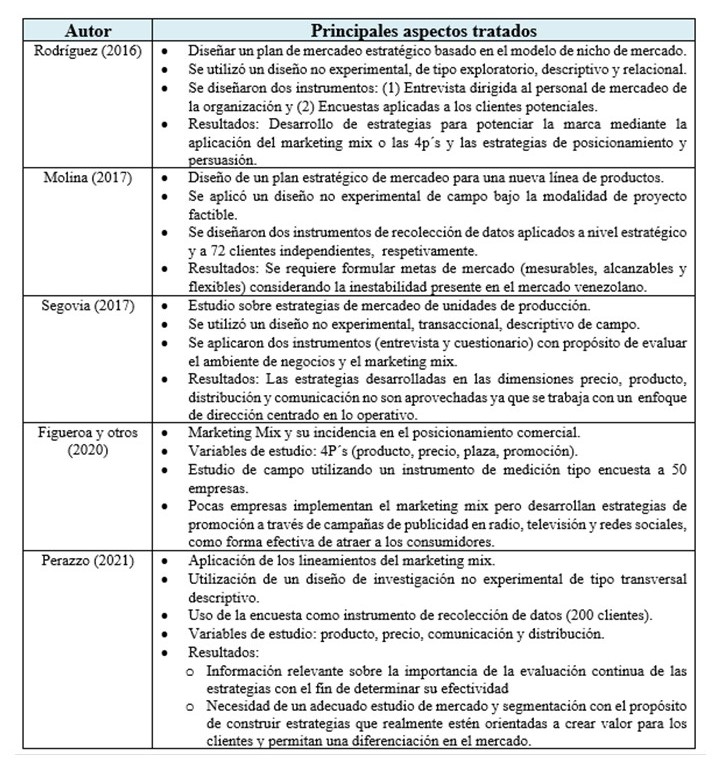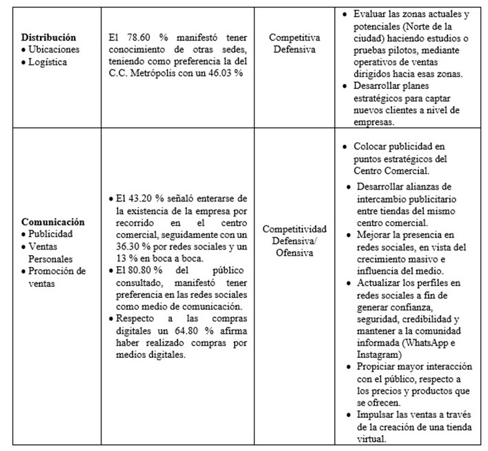 Es un hecho la existencia de sobreoferta de productos en la actualidad, esto lleva al empresario a buscar alternativas para aprovechar los nichos emergentes, fidelizar a los clientes y adaptarse a los cambios mediante el establecimiento de estrategias adecuadas que permitan aprovechar las ventajas competitivas (David, 2008; Serna, 2010). Esto último puede lograrse mediante el marketing estratégico y el marketing mix (Cuervo, 2001; Kotler y Armstrong, 2012; AMA, 2017; Ramírez y otros, 2021). Se reconoce que los comercios físicos y electrónicos coexisten y se complementan. Las organizaciones incorporan estrategias de venta apoyándose en la infraestructura tecnológica existente, siendo Internet y los dispositivos móviles el medio para utilizar las redes sociales y la web como una oportunidad para hacer frente la coyuntura económica, dar a conocer la marca y fidelizar clientes aumentando su presencia en el mercado.