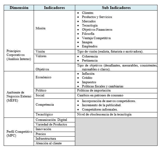 En este caso, en la dimensión ambiente de negocio externo se aplicaron modelos de autores reconocidos y de amplia trayectoria en el área de estudio (David, 2008). Todos ellos cuentan con validez y confiabilidad, por ser aplicados en diversas investigaciones de esta naturaleza.
