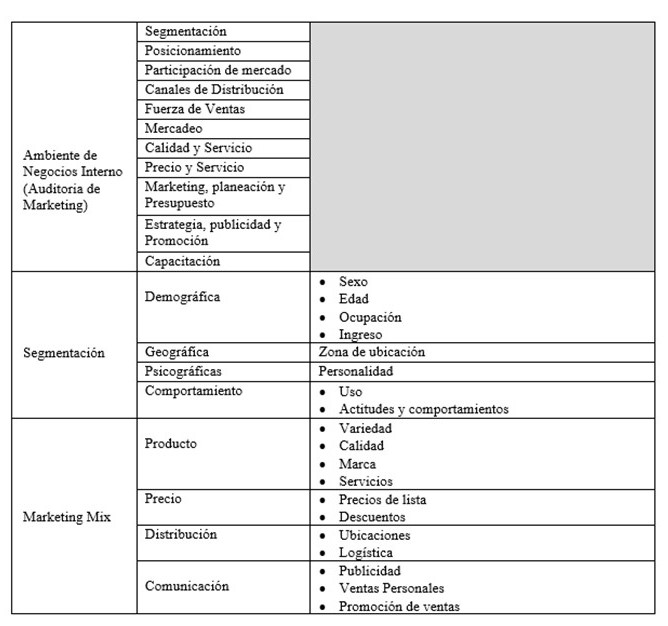 En el marco de la definición de estrategias de marketing se consideran relevantes los siguientes aspectos: los presupuestos asignados al área de marketing, contar con mecanismos óptimos para la segmentación del mercado para determinar aspectos demográficos, geográficos y psicográficos, así como la construcción del perfil del cliente ideal. Adicionalmente, se destaca la valoración por parte del cliente en cuanto a la variable: producto, tanto en sus aspectos tangibles como intangibles; atención al cliente y reconocimiento de la marca.