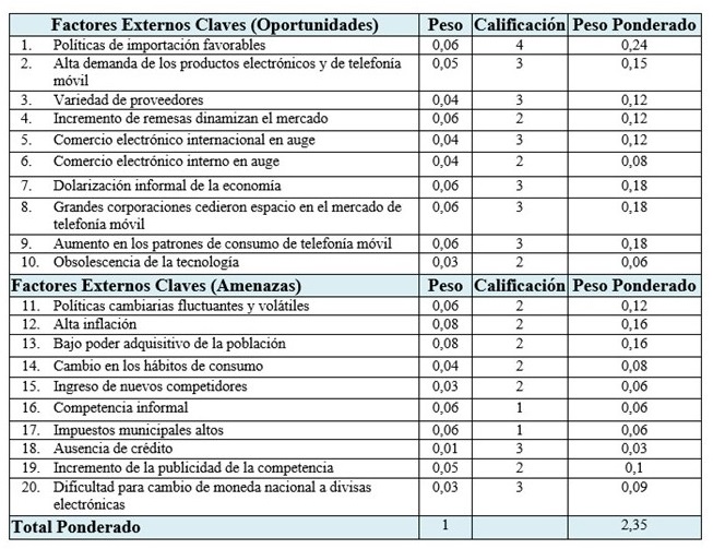 La identificación de oportunidades y amenazas es indispensable para el desarrollo de estrategias para dirigir eficazmente los recursos y encaminar a la organización a la consecución de sus objetivos. La ponderación obtenida indica qué tan eficazmente responden las estrategias actuales de la empresa a ese factor de éxito. Para el presente análisis de factores externos, el resultado obtenido es 2.35 indicando que la organización desarrolla estrategias que responden a las amenazas y oportunidades, sin embargo no lo hace de manera eficaz.