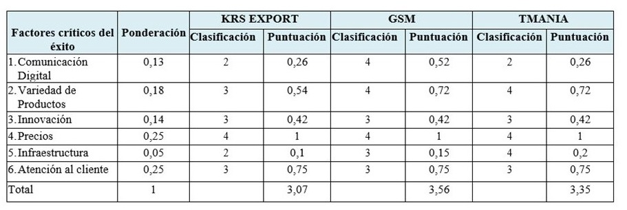 En lo que respecta al análisis los factores críticos de éxito en una MPC se incluyeron aspectos, tanto internos como externos; por consiguiente, las clasificaciones se refieren a las fortalezas y debilidades, donde 4 fortaleza principal, 3 fortaleza menor, 2 debilidad menor y 1 debilidad principal. Se debe ponderar a cada factor crítico de éxito de manera que oscile entre 0.0 (no importante) y 1.0 (muy importante). La ponderación indica la importancia relativa de ese factor para tener éxito en la industria.