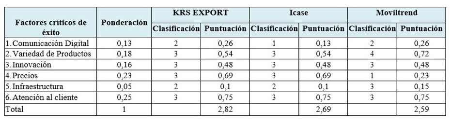 Para la elaboración de la "Matriz de perfil competitivo" se seleccionaron los tres mejores competidores de cada centro comercial, que coinciden con la oferta de productos de KRS Export y que poseen características similares o distintivas a la empresa. Esto con la finalidad de valorar las fortalezas y debilidades particulares, las cuales influyen en el proceso de toma de decisión y que permiten aprovechar mejor las oportunidades.