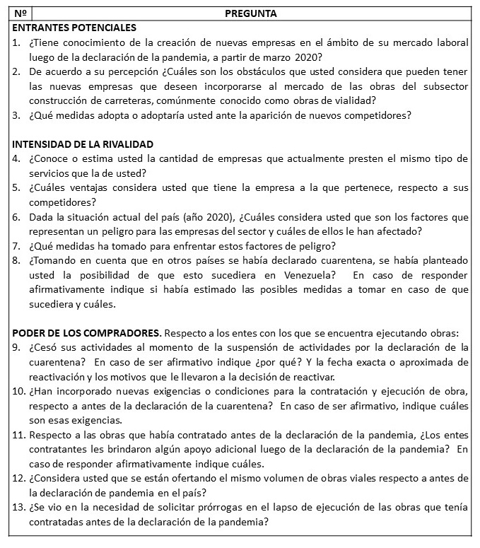 Abstract: The purpose of this study was to analyze the managerial strategies adopted by companies in the road construction subsector in response to the COVID-19 pandemic situation in Barquisimeto, the State of Lara, Venezuela. From a methodological perspective, it is a descriptive field research, in which is considered as a unit of analysis four (4) companies registered in the National Registry of Contractors and that executed road works projects with public institutions. The information was collected through a guided interview and a Likert scale questionnaire, allowing the application of tools such as Porter's Diamond. The conclusions indicate that these companies have a weak vision of the future due to the conditions of uncertainty, focusing their objectives on resolving the conditions that frame the environment in order to fulfill the execution of the project in the most effective way possible.
