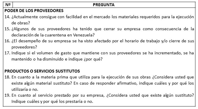 Se evaluó la disponibilidad en el mercado de los materiales e insumos requeridos para la ejecución de las obras, a lo que se obtuvo respuesta positiva. Los requerimientos de materia prima para este tipo de obras son los agregados pétreos para las construcciones y/o reparaciones de bases o elaboración de las mezclas asfálticas, el cemento asfáltico, el RC-250 (siendo estos dos últimos derivados del petróleo) y el concreto; los cuales son provistos por empresas mixtas o afines al gobierno que estuvieron en las mismas condiciones que las empresas de estudio, por lo que no tuvo una afección significativa. En este sentido, el poder de negociación afectó negativamente en las condiciones de tiempo y movilización debido al cumplimiento de las regulaciones gubernamentales, sobre los proveedores de insumos menores requeridos para el funcionamiento y operatividad de los equipos (lubricantes, repuestos, materiales para reparaciones específicas, entre otros), como ya se ha mencionado, pues este tipo de proveedores son empresas privadas no consideradas dentro del sector prioritario de funcionamiento en el país durante la situación de pandemia.