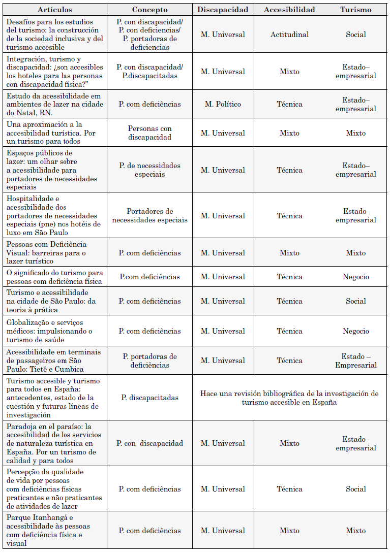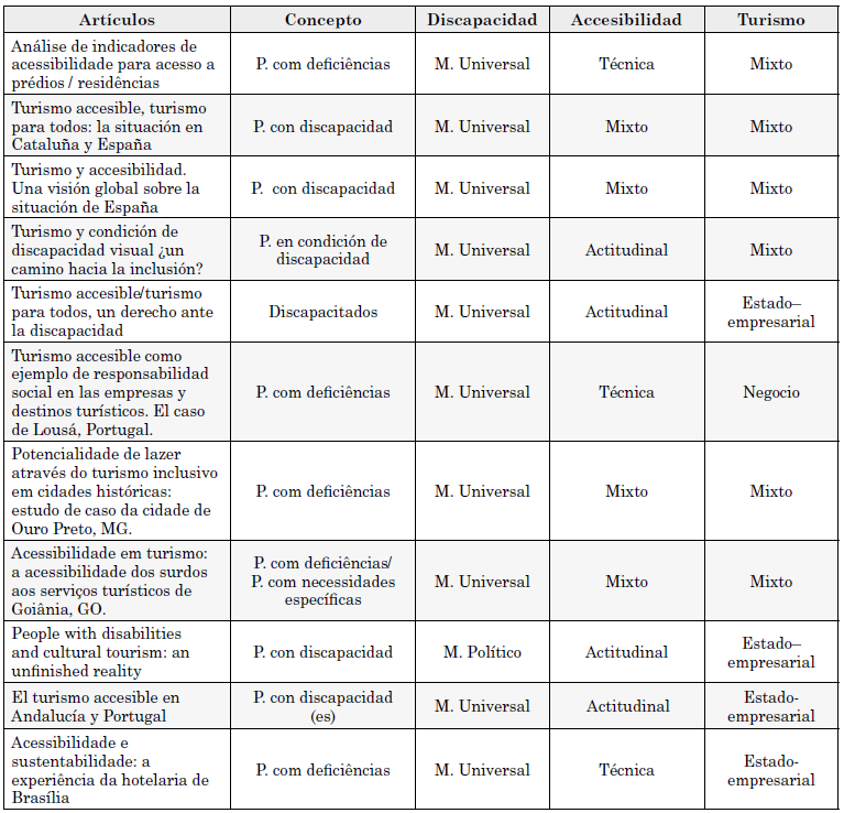 Una vez establecidos los parámetros de las unidades de registro, se organizó la información mediante la categorización de los artículos. El Cuadro 2 muestra los resultados ordenados por título de las publicaciones, conceptos utilizados para referirse a las personas con discapacidad, modelo de discapacidad dominante, comprensión de accesibilidad y turismo para personas con discapacidad. Cabe aclarar, que la frontera que divide la forma en que los autores interpretan las unidades de registro es débil, algunos no profundizan en los temas y las colocan en segundo plano, por lo que mezclan conceptos, y otros más conscientes, prefieren un lenguaje holístico; por tal motivo ciertos artículos se categorizaron como mixtos.
