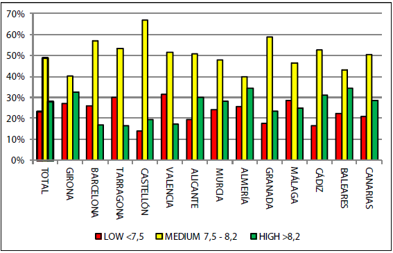 Cuando tratamos de ver la puntuación media por provincia observamos cómo, debido a la alta concentración en el tramo 7,0 -8,5, las provincias no muestran variaciones significativas claras sobre el 7,848 de media nacional, ya que éstas van del 7,752 de Barcelona y el 7,742 de Málaga al 7,982 de Canarias o el 7,969 de Cádiz (Tabla 2).