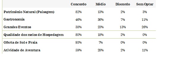 Para se ter melhor aprofundamento de análise sobre o local de estudo, foram feitas também perguntas relacionadas aos fatores decisivos em Barra Grande para a eleição desse destino, destacando o patrimônio natural, gastronomia, eventos, meios de hospedagem, oferta de sol e praia, e atividade de aventura (tabela 1). Essa análise ajuda a identificar a forma como Barra Grande se destaca para ser um destino bastante demandado.