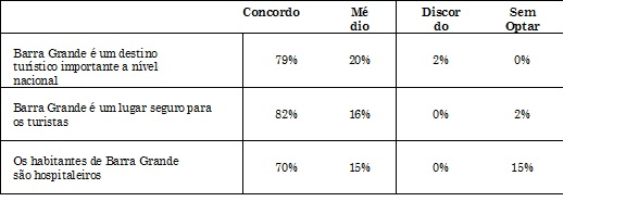 Esse modelo de avaliação, também foi usado para designar aspectos importantes na avaliação da imagem do lugar, dando ênfase a Barra Grande como destino turístico, onde foram analisados os perfis em que se encaixa Barra Grande, como importância do destino a nível nacional, segurança para os turistas, hospitalidade dos residentes, infraestrutura de transporte e comunicação (tabela 2).