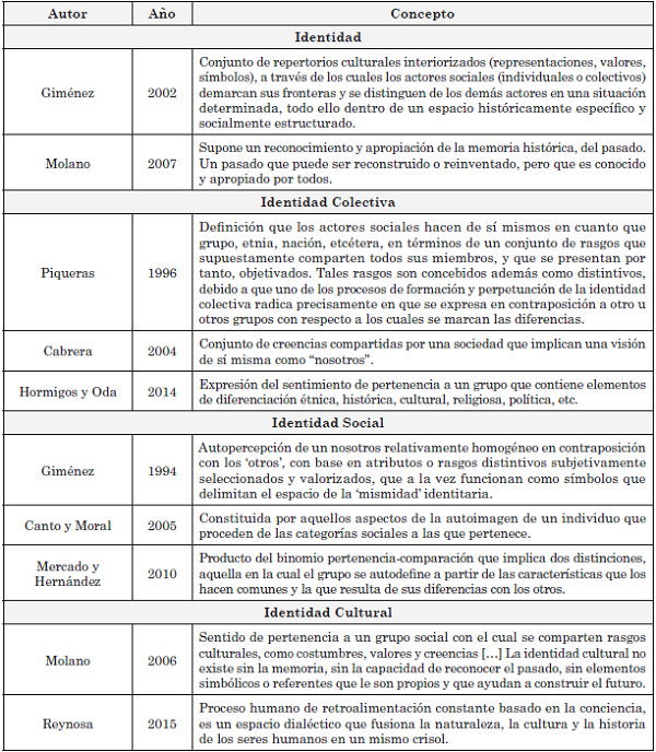 Como se puede apreciar en esta tabla, decenas de definiciones han delimitado los alcances de la identidad desde sus diferentes modalidades; esto significa que cada concepto responde a una diferenciación sobre los elementos que enmarcan la cultura y la personalidad de los individuos como unidad y a su vez como colectivo.