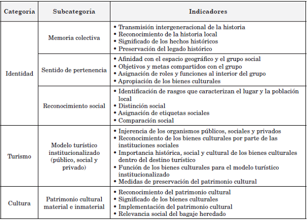 La propuesta metodológica aquí presentada tiene como objetivo reconstruir identidades a partir del reconocimiento de las concepciones locales sobre el patrimonio cultural material e inmaterial de los destinos turísticos. El contenido de la figura 3 propone algunos indicadores orientados a contribuir al análisis del trinomio desde los estudios turísticos. Esta propuesta también sirve de base para el diseño de instrumentos de investigación como: entrevistas, encuestas y cuestionarios, entre otros.