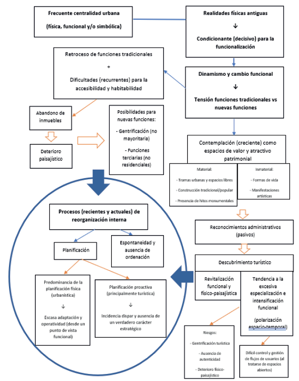 Pero, además, la realidad paisajística de los centros históricos se halla en estrecha interrelación con los cada vez más complejos procesos funcionales registrados en ellos. Se ha destacado en este sentido el recurrente retroceso de las actividades tradicionales y la pérdida de la multifuncionalidad que durante siglos los caracterizó, con las subsiguientes consecuencias de vaciamiento demográfico, problemas de conservación y habitabilidad, empobrecimiento de la vida urbana o desaparición de espacios públicos de convivencia, entre otros (Pérez, 1996; Troitiño, 1996). Pero, por otra parte, también se vinculan al hecho de que hoy aparecen como lugares privilegiados para el desarrollo de nuevas funciones, como las de carácter administrativo, sociocultural o educativo, de efectos indudablemente positivos en forma de recuperación del patrimonio y dinamización de determinadas áreas (UNESCO, 2013; García et al., 2016; Kwan et al., 2017; Aparicio et al., 2018). Entre estas últimas ocupa una posición muy destacada el turismo, y así se ha reflejado en la bibliografía. El descubrimiento turístico de los centros