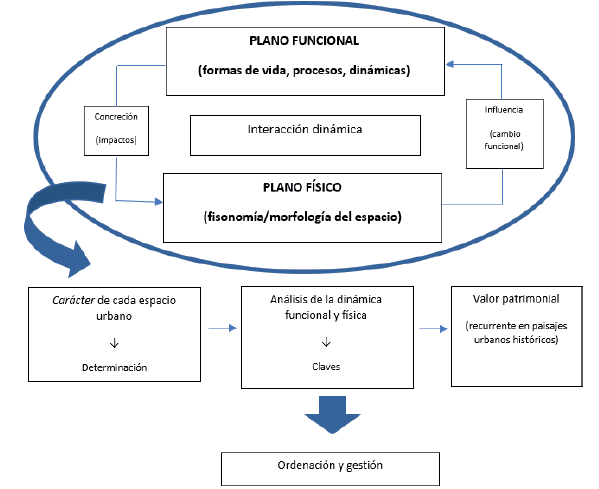 Partiendo de la concepción de los cascos antiguos como entornos dotados de un sobresaliente significado histórico‑cultural, pero también estético e incluso simbólico, y desde la visión integral u holística asumida, el análisis se plantea en un doble plano: el funcional, reflejo de las formas de vida, de la cultura, y el formal, relativo a la organización fisonómica del espacio vivido (Zoido, 2012a; 2012b). Se trata de un doble plano en continua interacción, que explica el territorio como realidad activa, en constante construcción y evolución, y que permite entender lo propio y diferencial de cada lugar y, más en concreto, de cada paisaje urbano, su carácter (Mata, 2008).