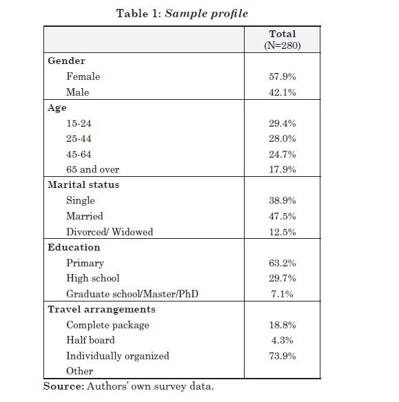 The questionnaire contains three main sections. In the first section, information about push and pull motivation was collected. Respondents were asked to specify how important each item is to them when making travel decisions using a five‑point Likert scale (1 = not at all important; 2 = not very important; 3 = neutral; 4 = important; 5 = very important). A total of 25 push and 28 pull motivation items were used based on a previous empirical research conducted by Mendes and Vareiro (2012), which was adapted from Kim et al. (2006). In the second section, respondents were asked to specify general information about their tourist travel made in 2011 (number of trips, length of stay, destination, travel group size, major reason for travel, trip organization). In the final section, information on socio‑demographic characteristics such as gender, age, residence, marital status, and education was collected.