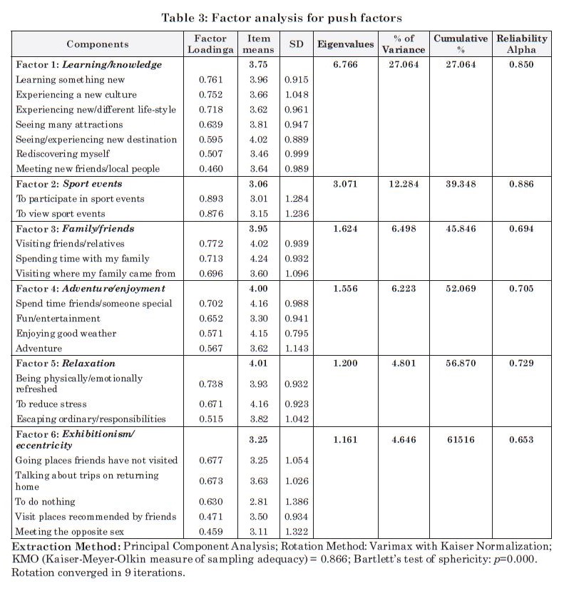 The push factors provide information on what internally encourages residents to travel, while pull factors indicate which attributes of the destinations are more attractive. Thus, planners of destinations can use the results to understand their competitive positions in the market (Jang & Cai, 2002).