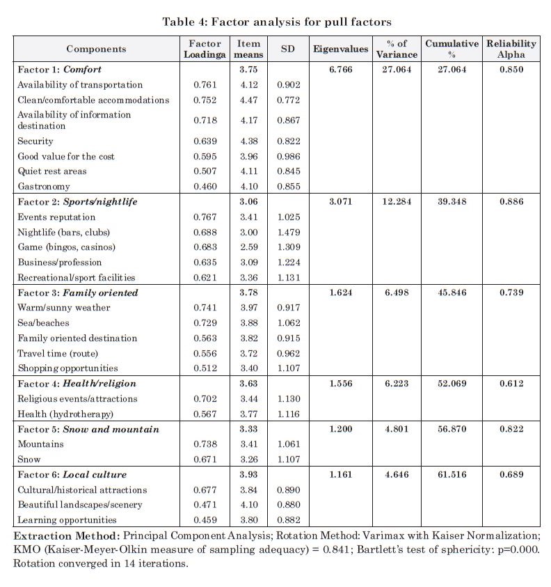 Pull factors. As drawing forces into travel destinations, the 24 pull items (after 4 items were deleted: 2 because they did not fit into the included factors, and 2 had high loading factors in 2 factors and the decision to be made was unclear) also resulted in 6 factors with eigenvalues greater than or equal to one, and the factors accounted for 61.52% of the total pull variance, as presented in Table 4. The first pull factor was labeled Comfort and explained 27.06% of the variance with a reliability coefficient of 0.85. It is followed by factor 2 Sports/nightlife (12.28% of the total variance and Cronbach’s alpha level of 0.89), comprised of items related to “events reputation”, “nightlife (bars, clubs)”, “game (bingos, casinos)”, “business/profession”, and “recreational/sport facilities”. Factor 3, labeled Family oriented, explained 6.5% of the variance contained by the original variables, with the alpha level of 0.74. The fourth factor was named Health/religion and explained 6.22% of the variance with a reliability alpha of 0.61. With a reliability coefficient of 0.82, factor five, Snow and mountain, accounted for 4.8% of the variance. The final factor represented 4.65% of the total statistical variance and had a reliability alpha of 0.69. This factor is associated with the “cultural/historical attractions”, “beautiful landscapes/scenery” and “learning opportunities”.
