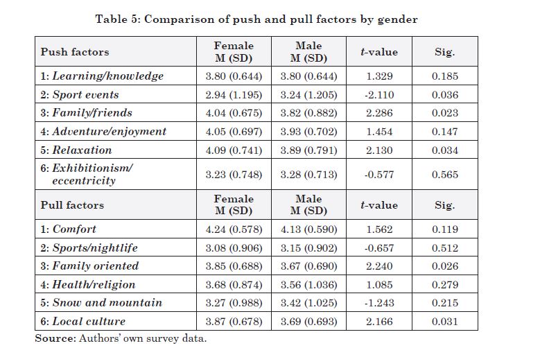 The most important pull factor for both groups was Comfort, followed by Local culture. Also, both gender groups placed Sports and nightlife as the least important factor among the pull factors.