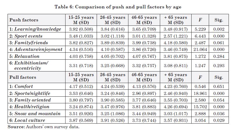 The comparison of the mean scores of push and pull factors by age shows that older tourists are more likely to travel for reasons based on Family/friends and Comfort, whereas younger tourists are more likely to travel to enjoy Sports/nightlife and to have Adventure/enjoyment.