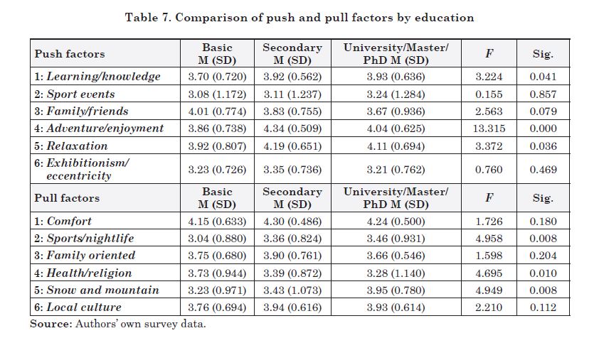 Finally, less educated residents are less likely to travel based on Adventure/enjoyment, Relaxation, and Learning/knowledge motivations compared with the other groups. With regard to the pull factors, travellers with basic education are more likely to travel based on Health/religion motivations than are the more educated residents.