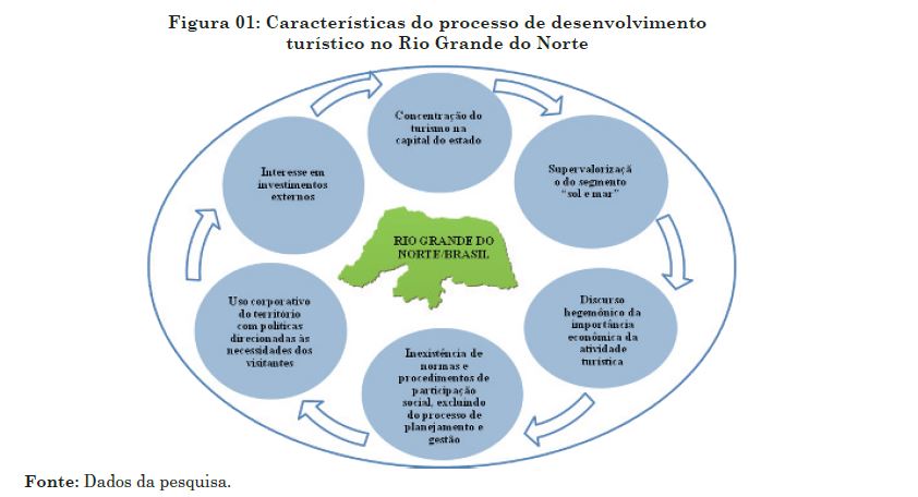 Com base no exposto, desenham‑se, na figura 01, algumas características do processo de desenvol‑ vimento turístico norte‑rio‑grandense que foram explicitados correlacionando com o uso do território turístico baseado em relações de poderes.