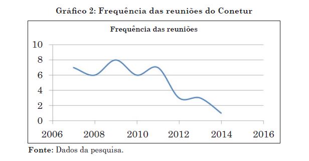 O Conetur atua nos seguintes procedimentos, segundo seu documento normativo: são realizadas reuniões ordinárias bimestralmente e as reuniões extraordinárias quando convocado pelo presidente, obtendo no mínimo 20% de quórum. O local de realização se dá via rodízio de espaços disponibilizados junto a instituições que compõem o conselho, visando o aumento do comprometimento dos conselheiros e redução dos custos. No entanto, observando o registro das atas disponibilizadas, há uma oscilação no que tange à frequência das reuniões, que pode ser observada no gráfico 02.