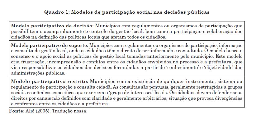 De acordo com a Alió (2005), o primeiro modelo reúne uma série de mecanismos para que a participação e colaboração de todos os envolvidos se efetivem. Esse é um modelo ideal de participação, requerendo um alto nível de percepção por parte da gestão e envolvimento por parte da comunidade. Exemplos como esses são difíceis de acontecer. O segundo modelo pode ser classificado como misto ou de transição, em que aparecem formas pontuais para a inclusão dos cidadãos na política. Este é o caso de algumas consultas populares. O terceiro e último modelo de participação é limitada, e, embora seja bastante difundido, fica subordinado às formas e decisões da liderança administrativa, legitimada por meio do sistema de participação representativa. Essa é uma das formas mais usuais da atualidade.