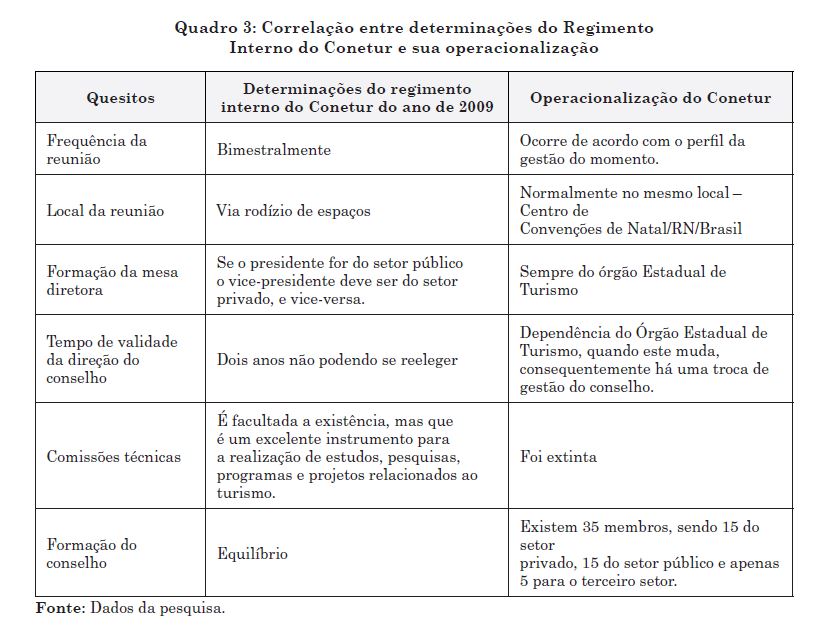 Importa destacar, ainda, que a atividade turística necessita de planejamento e de gestão eficiente; logo, as instâncias de governança se tornam fundamentais, uma vez que, por meio da interação de diversos setores e vozes no processo de implementação, gestão e controle, é possível tomar decisões, planejando o turismo de maneira articulada. A discussão de governança em turismo ainda é incipiente com um olhar crítico e profundo que considere as relações, processos e resultados sobre seus desdobramentos, e como essas relações podem influenciar as decisões. Desse modo, acredita‑se que este trabalho possa contribuir para entender a dinâmica, processo e funcionamento do desenvolvimento turístico no RN e os reflexos no Conselho Estadual de Turismo (Conetur), obtendo diferentes atores na sua constituição para o processo de planejamento e gestão da atividade turística no estado do RN.