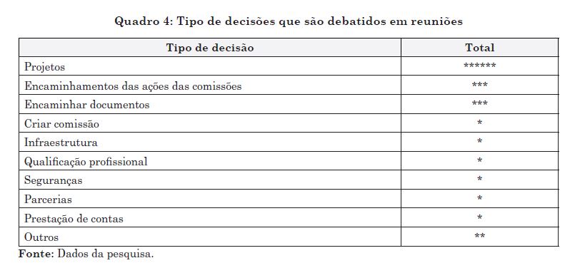 Observa‑se no conselho que as questões mais discutidas estão relacionadas à elaboração de projetos e ao encaminhamento de ações das comissões indicando, de modo geral, um baixo grau de efetividade, uma vez que suas decisões produzem menor impacto sobre a política. As questões que foram mais dis‑ cutidas em uma parte das reuniões, tais como a organização interna e encaminhamento de documentos,