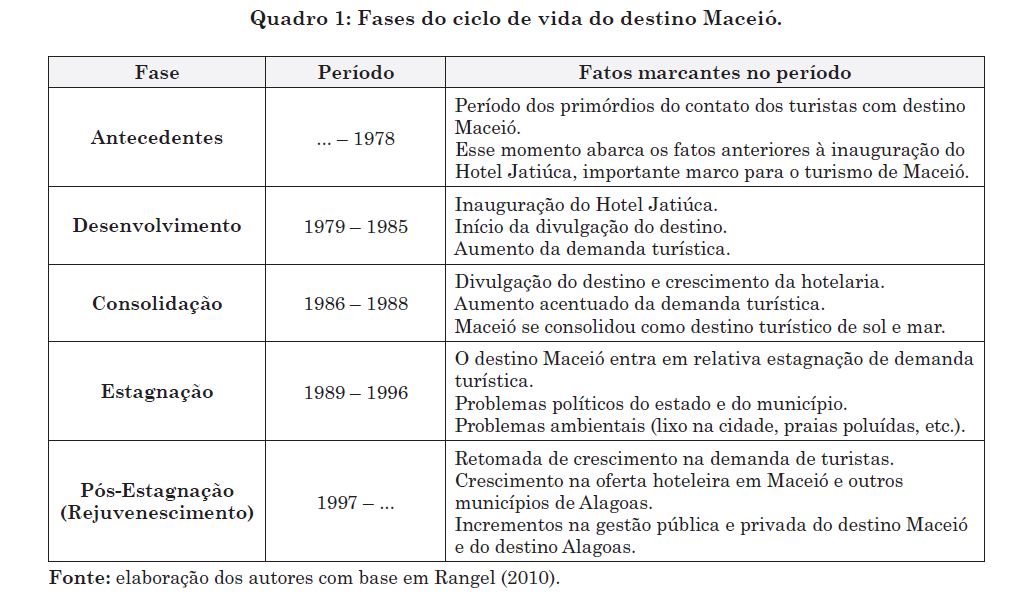 Em estudo sobre o ciclo de vida do destino Maceió, com base no modelo TALC – Tourist Area Life Cycle, de Butler (1980), Rangel (2010) identificou as fases do ciclo de vida desse destino, até o ano de publicação do seu estudo (2010). O modelo de Butler (1980) distingue cinco fases evolutivas de um lugar turístico, a saber: Exploração, Envolvimento, Desenvolvimento, Consolidação e Estagnação. Rangel (2010) situa temporalmente as seguintes fases do ciclo de vida do destino Maceió (Quadro 1): Antecedentes (1937‑1978), Desenvolvimento (1979‑1985), Consolidação (1986‑1988), Estagnação (1989‑1996) e Pós‑estagnação (a partir de 1997). Diante da inexistência de dados para caracterizar as fases Exploração e Envolvimento, Rangel (2010) denominou o tempo anterior à fase Desenvolvimento de “Antecedentes” e analisou o ciclo de vida desse destino a partir da fase Desenvolvimento.