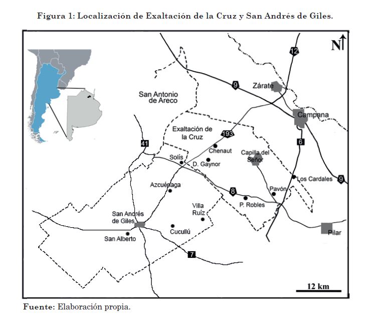 El partido de San Andrés de Giles se ubica hacia el norte de la provincia de Buenos Aires (Figura 1), a unos 105 km –aproximadamente‑ de CABA. Cuenta con 23.027 habitantes (INDEC, 2010). Está compuesto por su ciudad cabecera homónima y varios pueblos y parajes, en su mayoría conformados a partir de la extensión de las vías ferroviarias (entre fines del siglo XIX y principios del XX) que atraviesan el partido. Entre ellos podemos mencionar: Azcuénaga, Villa Ruíz, Cucullú, San Alberto, Espora, Franklin, Villa Espil, siendo un total de 15 asentamientos. El distrito es de fácil acceso, mediante la ruta nacional 7 y la provincial 41. Linda con los municipios de Exaltación de la Cruz, San Antonio de Areco, Suipacha, Luján, Mercedes y Carmen de Areco.
