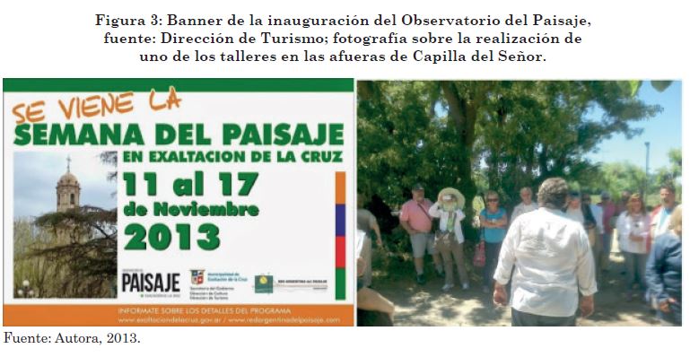 Así, en 2013 el municipio de Exaltación de la Cruz presentó y formalizó un Observatorio del Paisaje (Figura 3) con el propósito de: “… garantizar la protección, gestión y ordenamiento del paisaje de Exaltación de la Cruz a fin de preservar sus valores naturales, patrimoniales, culturales, sociales y económicos en el marco de un desarrollo sostenible (…) tendrá funciones de catalogación, sensibilización de la sociedad asesoramiento al Municipio y educación en materia de paisaje” (Ordenanza 42/2013). El observatorio toma como modelo al instalado en Cataluña (http://www.catpaisatge.net/) y cuenta con el apoyo del nodo Buenos Aires de la Red Argentina del Paisaje. Se compone de una comisión asesora integrada por un equipo interdisciplinario de profesionales que colaboran con la planificación de las acciones a realizar; y una comisión promotora, formada por autoridades y residentes de Exaltación de la Cruz interesados en participar en la planificación y regulación de las “unidades de paisajes” identificadas en el partido. Entre ellos, se encuentran funcionarios del área de cultural, patrimonio y turismo. Asimismo, a partir de las actividades y talleres que a través de ella se realizan anualmente en las escuelas y otros ámbitos, se incentiva a las comunidades –de las áreas urbanas y rurales del distrito‑, a poner en valor ‑o “descubrir”‑ aquellos elementos cotidianos con otra mirada; pero a la vez, produce un espacio en el que residen de las áreas más anegadas puedan elevar propuestas y demandas sobre carencias y problemáticas.