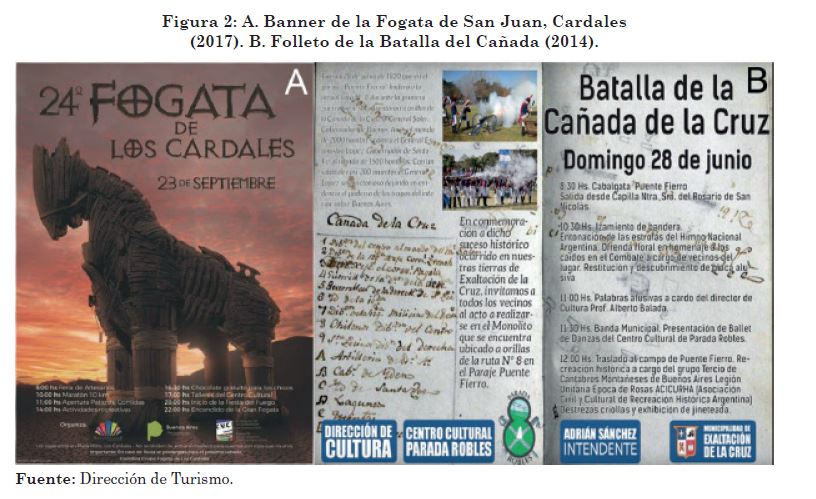 La Fogata de San Juan –que anteriormente se organizaba en Capilla del Señor‑ comenzó a festejarse en 1994 en Cardales. Ella se tornó una actividad multitudinaria a la que se le fueron incorporando otras atracciones como puestos gastronómicos, venta de artesanías y la organización de talleres recreativos para chicos, culminando con la esperada quema del muñeco elaborado para la ocasión. En 2017 se celebró la edición número 24 (Figura 2).Asimismo, reproducciones realizadas ‑por los miembros del centro cultural de Parada Robles‑ de la Batalla de la Cañada5, resultan eventos culturales locales autogestionados ‑con apoyo municipal‑ que terminan siendo resignificados como atractivos turísticos por la Dirección de Turismo. Actualmente, estos eventos forma parte de la agenda de actividades promocionada también por la Subsecretaría de Turismo bonaerense en la Guía de “Fiestas Populares” (SECTUR, 2018), mostrando la relevancia que han adquirido.