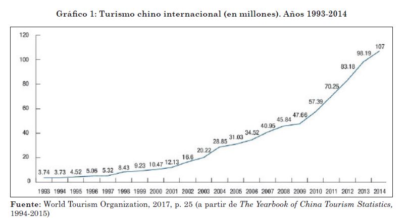 Por su parte, el turismo chino internacional comenzó con una etapa inicial de prueba (1983‑1996) en la cual se permitía salir del país a visitar a parientes a unos destinos concretos ‑Hong Kong, Macao, Thailandia, Malaysia, Singapur, Filipinas‑ y a partir de 1987 también se aprobaron las visitas cortas en las zonas de frontera ‑Corea del Norte, Mongolia, Rusia, Vietnam, Laos, Mynamar‑. Durante la segunda fase (1997‑2001) se abrió el turismo al exterior a partir de las “Provisiones sobre la Gestión del Viaje al Extranjero de los Ciudadanos Chinos” (1997) (Andreu, Claver y Quer, 2013). Se creó el Estatus de Destino Aprobado (EDA) que progresivamente incluyó a más países. En este periodo se aprobó el viaje turístico a los siguientes países: Corea del Sur, Australia, Nueva Zelanda, Japón, Vietnam, Camboya, Myanmar, Brunei, Malta, Indonesia, Turquía y Nepal. La tercera fase (2002‑actualidad) es la de la consolidación del turismo hacia el extranjero, al pasar de 18 países con el EDA en 2001 a 150 a finales de 2014. En 2004 se añadieron 61 países a esta lista, entre ellos España, Francia, Italia, Portugal, etc. (World Tourism Organization, 2017).