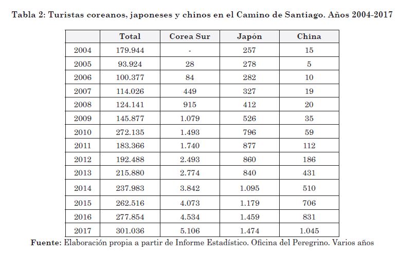 Los turistas chinos que han realizado el Camino han pasado de 15 el año 2004 a 1.045 en 2017 (Informe Estadístico de la Oficina del Peregrino). Otros países de Asia Oriental superan a China en este viaje. El promedio de la población de Corea del Sur y de Japón cuenta con mayor experiencia turística y más capacidad consumo y sus intercambios con España han sido más intensos. Japoneses y coreanos conocen mejor la cultura, tradiciones, arte e historia de Europa y de España y la publicación de libros y producción de películas y documentales sobre el Camino han sido determinantes para darlo a conocer en sus países y suscitar el interés para realizarlo.