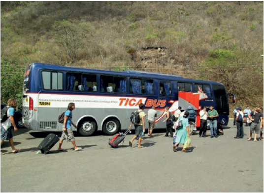 El control de ingreso y salida de personas en un país, la revisión de pasaportes y las inspecciones aduaneras son también externalidades políticas. De acuerdo con el acuerdo CA‑4, hay libre tránsito por el istmo centroamericano y facilidad para realizar los trámites en las fronteras (Segovia, op. cit.). No obstante, la falta de infraestructura aduanera, los conflictos fronterizos la región y la presencia del narcotráfico, han hecho que tanto en la frontera entre Nicaragua y Costa Rica como en la de Honduras y El Salvador, los turistas permanezcan en los autobuses al momento de hacer los trámites fronterizos. En todas las fronteras terrestres se realiza un estricto control de revisión de equipaje, de forma manual, que obstaculiza la movilidad regional. Allí se exige a los usuarios del autobús a descender de la unidad y surgen relaciones de poder entre locales y extranjeros porque los últimos son interrogados (Figura 1).