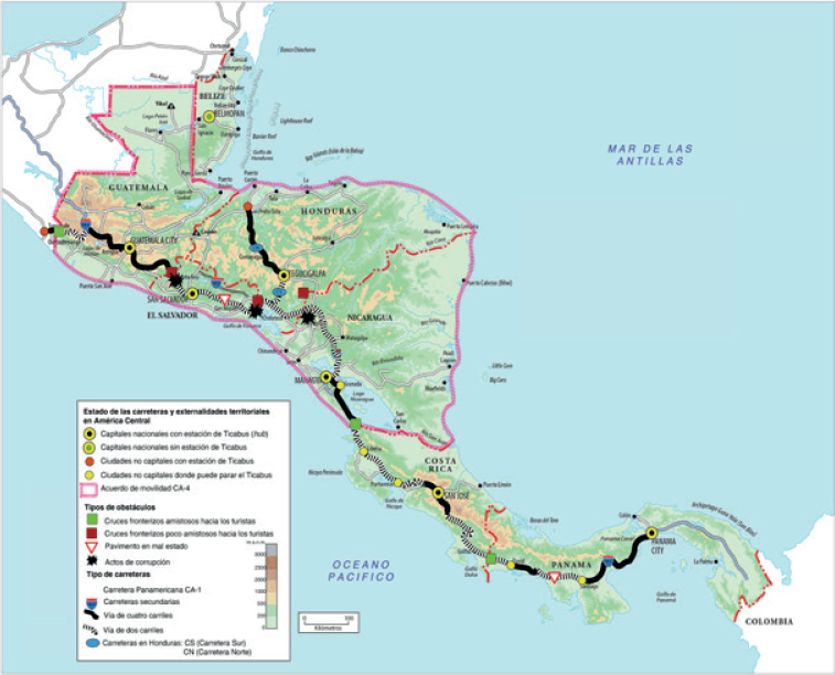 Resumen: El turismo se ha convertido en una de las fuerzas motrices del proceso de integración centroamericana contemporánea y, como resultado, se ha consolidado la ruta de transporte terrestre Ticabus (RTT). La RTT es un recorrido terrestre que vincula a Tapachula, México, con la ciudad de Panamá a través de la Carretera Panamericana. Con 2526 km de longitud, cruza por seis de los siete países del istmo centroamericano y con excepción de dos localidades (Tapachula, México y San Pedro Sula, Honduras), los puntos de origen‑destino son las capitales nacionales de América Central. Sin embargo, a pesar del tamaño de los países, de la presencia de infraestructura carretera y del vínculo directo entre capitales nacionales, hay una serie de externalidades territoriales, dadas por condiciones políticas, económicas y sociales que potencian la fricción del espacio y evidencian la dificultad del dinamismo territorial en América Central.