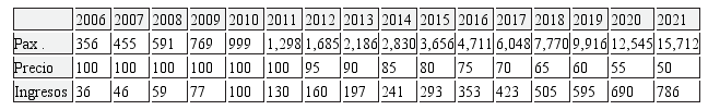 Haciendo tales ajustes, la previsión de la demanda queda expresada en la siguiente tabla, que incluye también una previsión de los ingresos en pesos mexicanos generados por concepto de TS, tomando en cuenta un precio base de cuatro millones de pesos (equivalente aproximado a los 200,000 USD que se consideran como precio del TS, véase p. ej. Filgueiras, 2016).