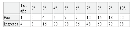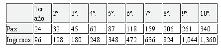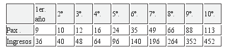 Desde luego, si todas las personas decidieran viajar en los primeros diez años a los que se refiere el pronóstico, las cifras de demanda serían mucho más altas. Sin embargo, se ha preferido, siguiendo el ejemplo de Tauri (2012), asumir una cifra conservadora. Se asumió que este 40% viajaría a un ritmo de 1% el primer año, creciendo después al 1.1, 1.3, 1.7, 2.5, 3.5, 4.7, 6.2 y 8%, hasta llegar a un 10 % en el último año, tratando de representar así la fase de introducción de un producto tan nuevo, hasta el inicio de la fase de crecimiento, según los modelos usuales del ciclo de vida del producto (véase Kotler et al., 2011: 323). Se trata, quiere recalcarse, de una forma muy conservadora de abordar el tema.