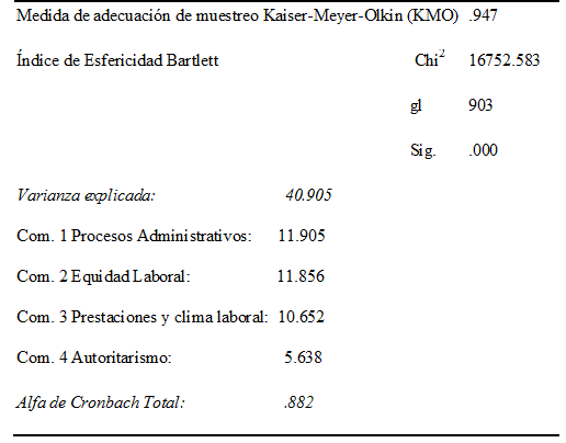 Por lo tanto, el resultado del análisis muestra que la consistencia interna del instrumento en general, es aceptable al obtener .88 en el modelo de Alfa de Cronbach (Oviedo y Campo-Arias, 2005). Igualmente se observa que arrojó cuatro componentes que explican el 40.90 de la varianza, mismos que en el cuadro 1 muestran su aporte en la estructura factorial. Esto es, la forma como se concentraron los distintos reactivos del instrumento dio lugar a cuatro grupos que por el tipo de variables que los componían nombramos como: procesos administrativos, equidad laboral, prestaciones y clima laboral y autoritarismo. En el primero denominado procesos administrativos, se agruparon aquellos reactivos relacionados con los mecanismos institucionales para la prevención y atención del hostigamiento sexual, la intimidación y el maltrato así como los relativos al ingreso, la promoción, la capacitación y los procedimientos para el acceso a puestos directivos.